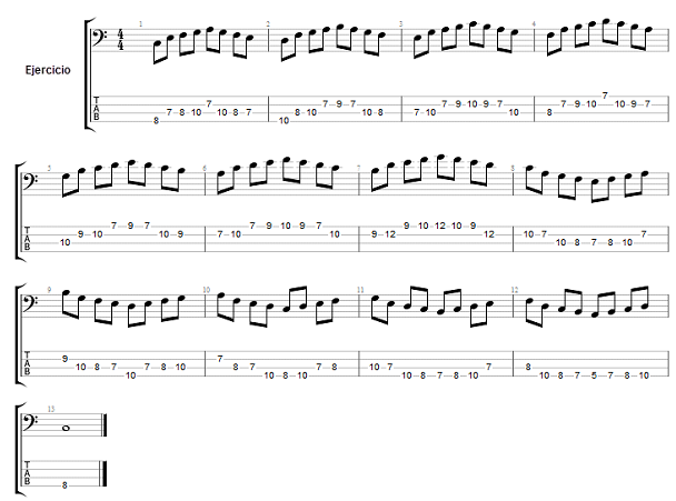 El ejercicio mantiene los mismos principios utilizados en los ejercicios técnicos anteriores en donde deberemos de mantener un dedo por traste y practicarlo a diferentes velocidades, además podemos realizar variaciones sobre el ejercicio por ejemplo tocar cada compas dos veces y pasar al siguiente etc.
